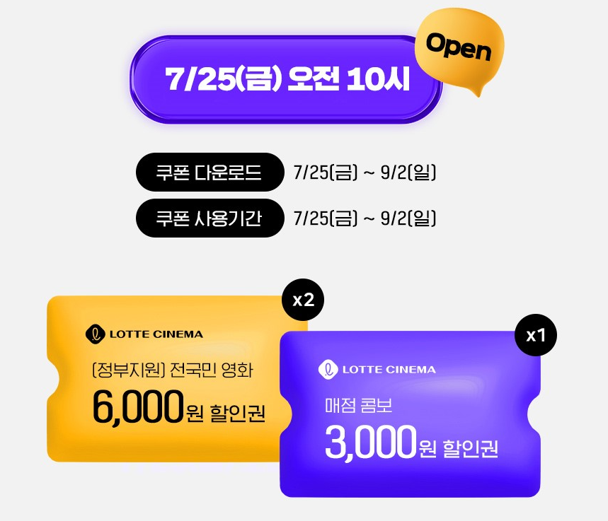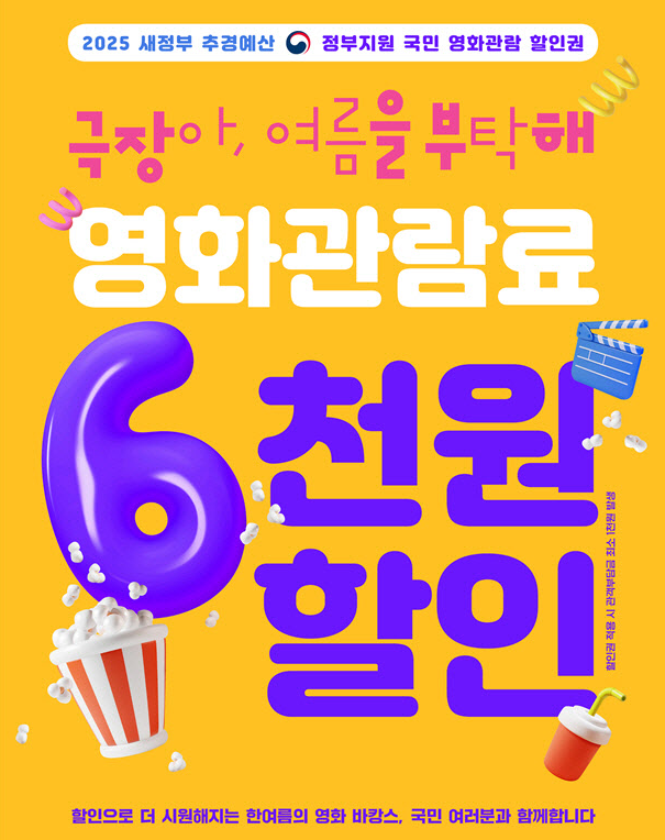 문화체육관광부와 영화진흥위원회는 오는 7월 25일 오전 10시부터 전국 영화관에서 사용할 수 있는 6,000원 할인권 총 450만 장을 배포한다고 밝혔습니다.